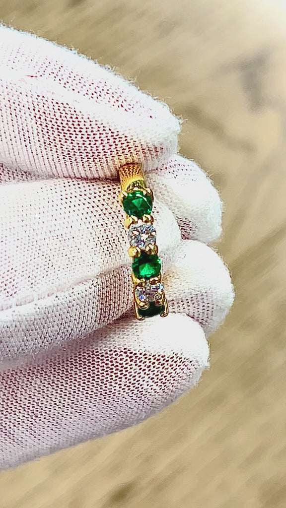 This gorgeous band holds two diamonds weighing 0.50ct, and three emeralds weighing 0.60ct! The stones are set in warm 18k yellow gold, creating a beautiful piece for any occasion!